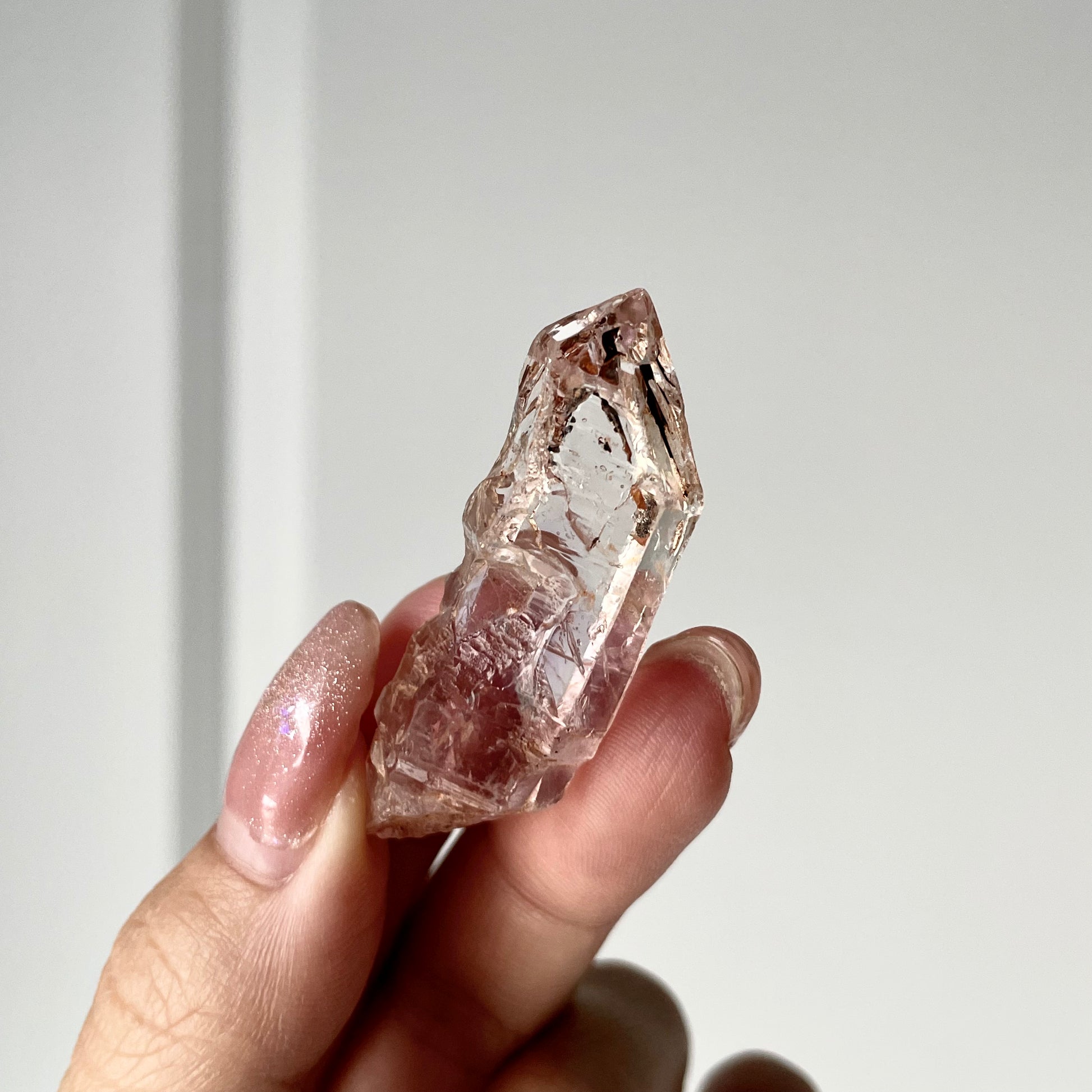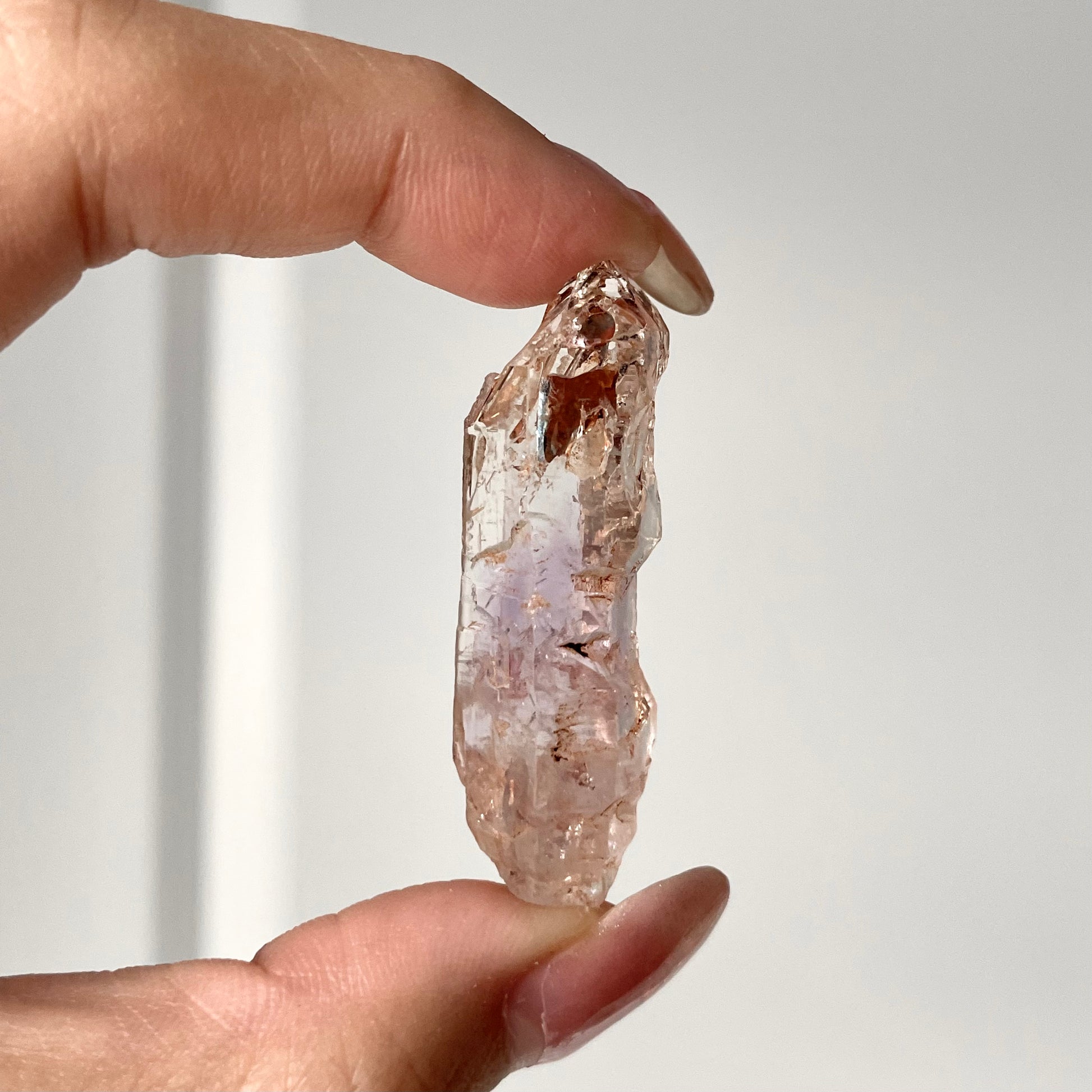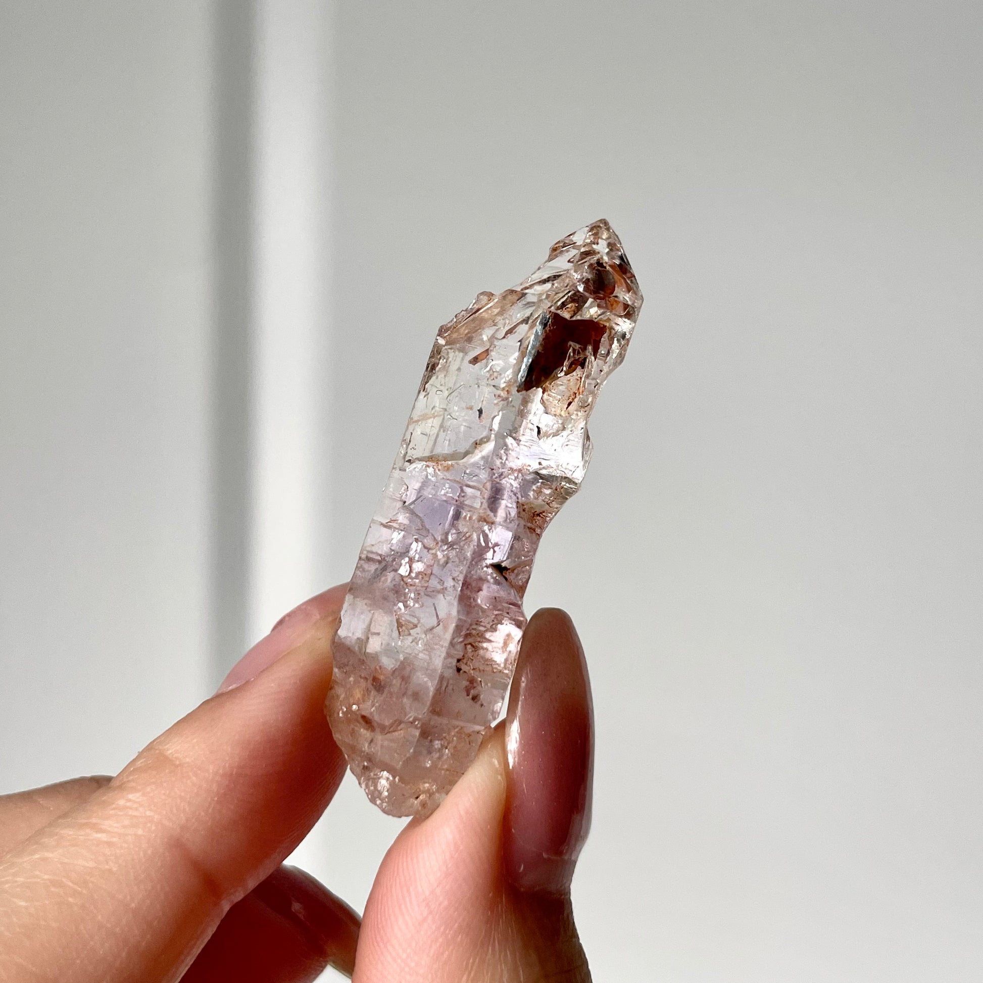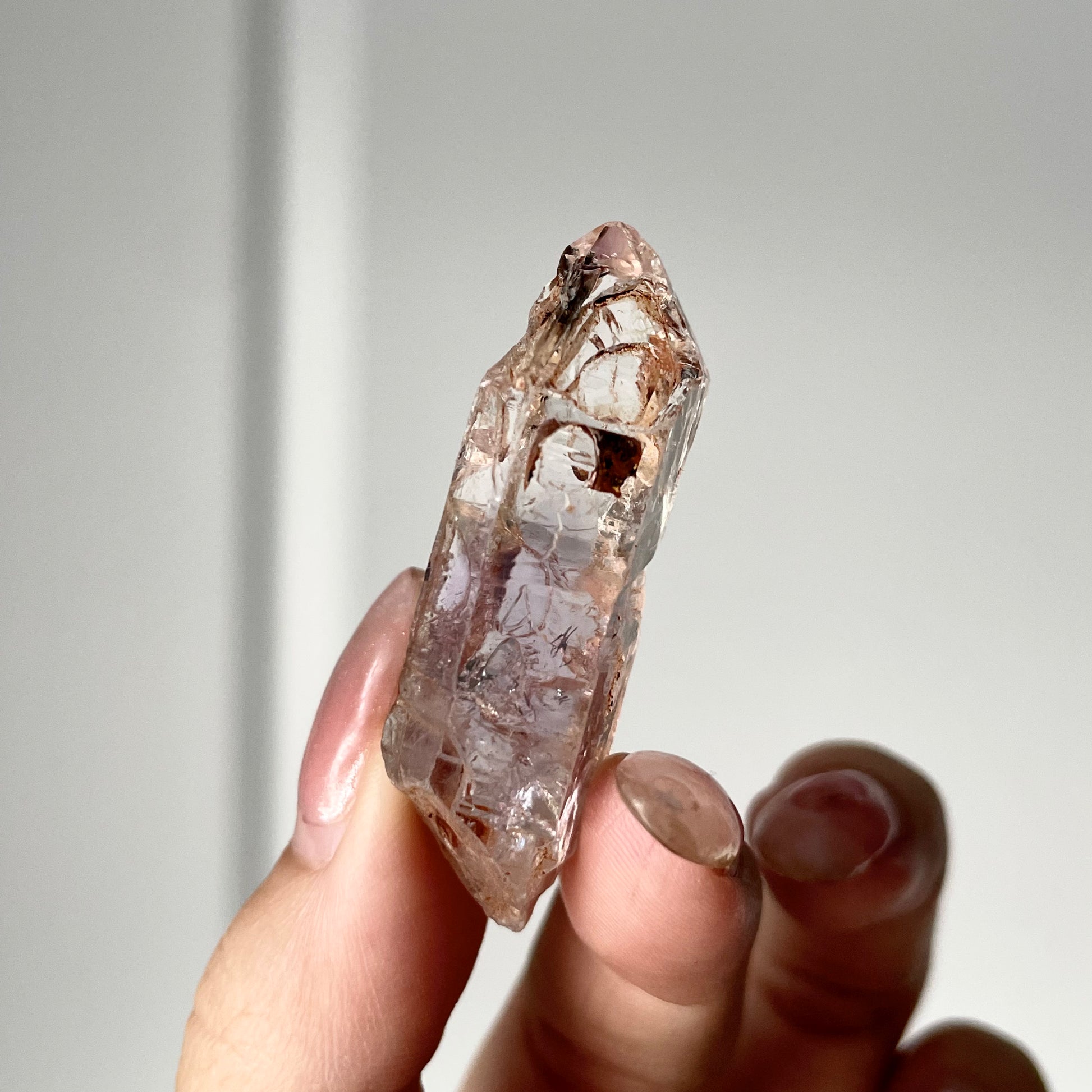 This unique crystal is characterized by its clear skeletal structure and the presence of red clay inclusions. The combination of these elements creates a powerful stone with high vibrational energy. It assists in helping to dissolve long-standing karmic issues in a way that aligns with personal spiritual growth.