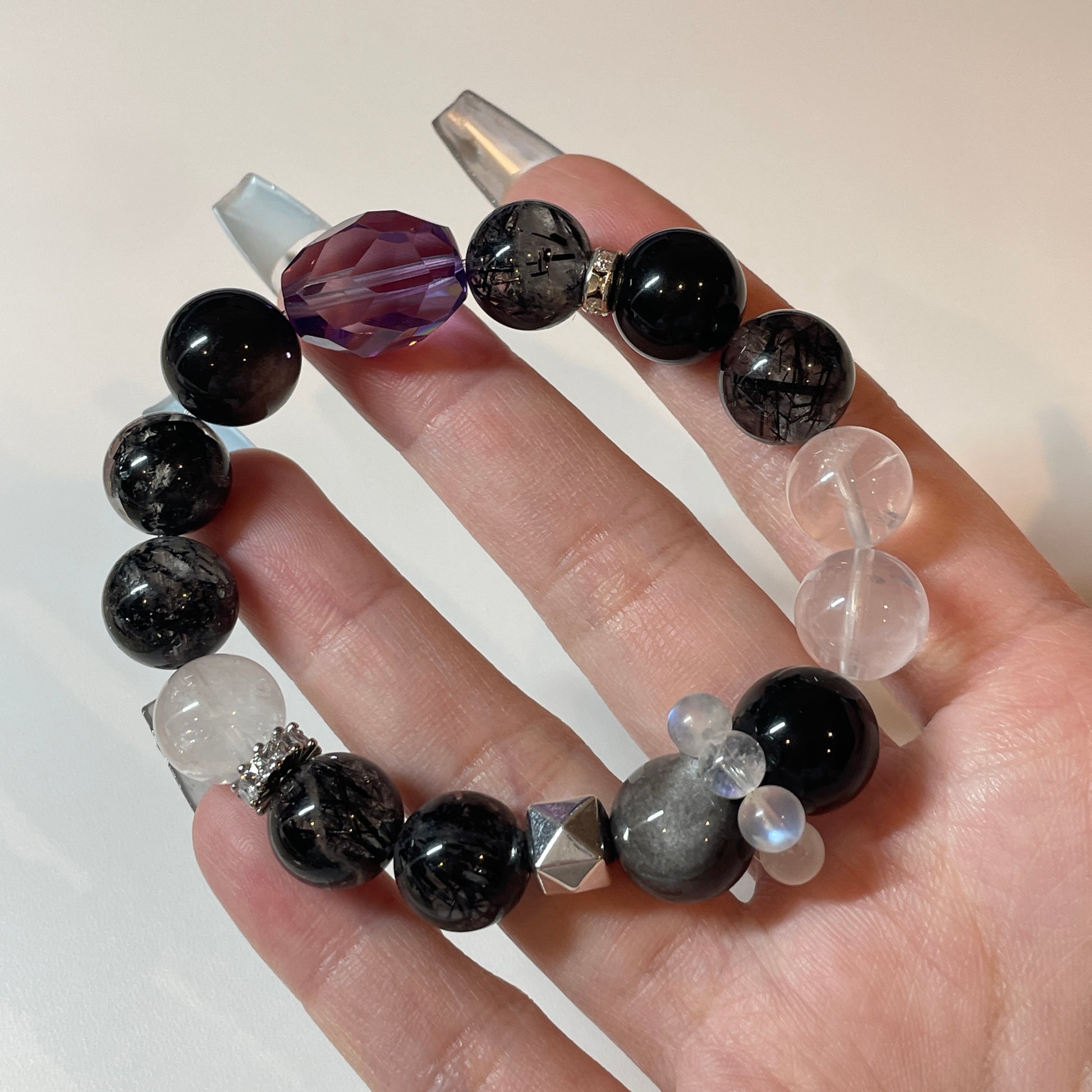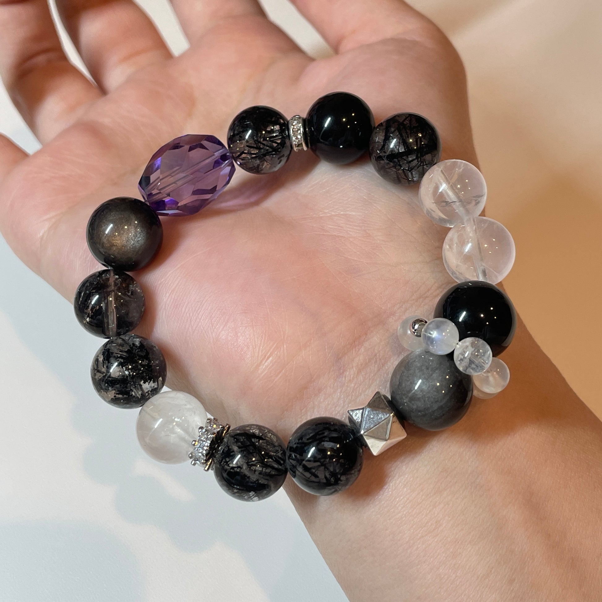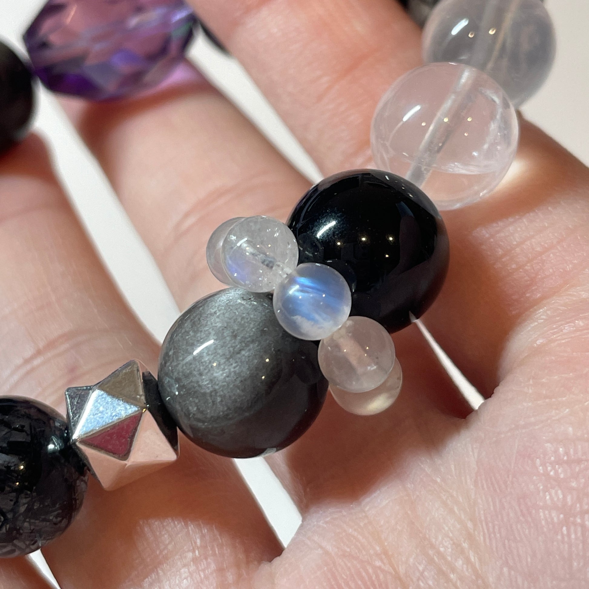 Designed with moonstone, obsidian, amethyst, clear quartz, herkimer diamond
