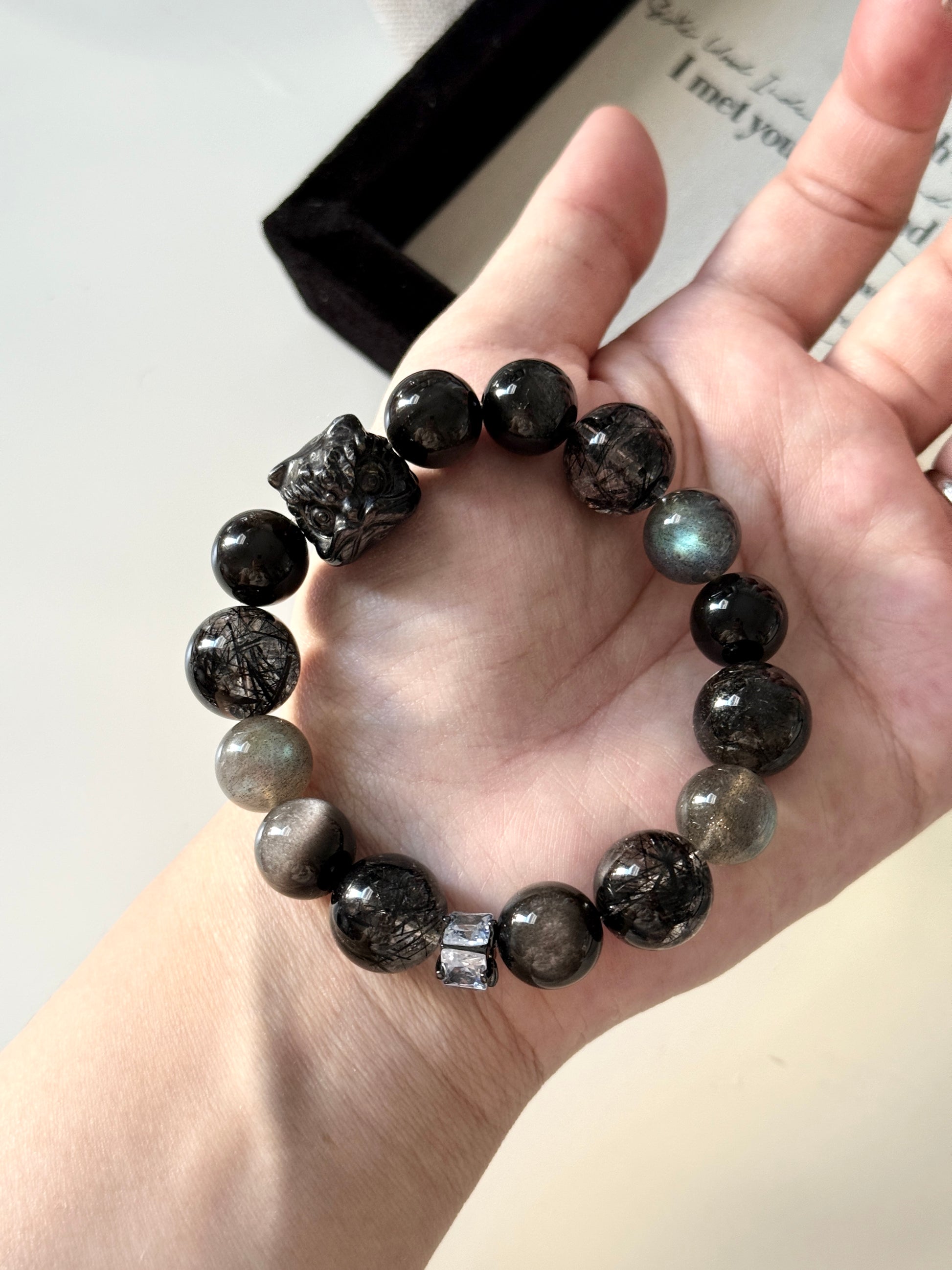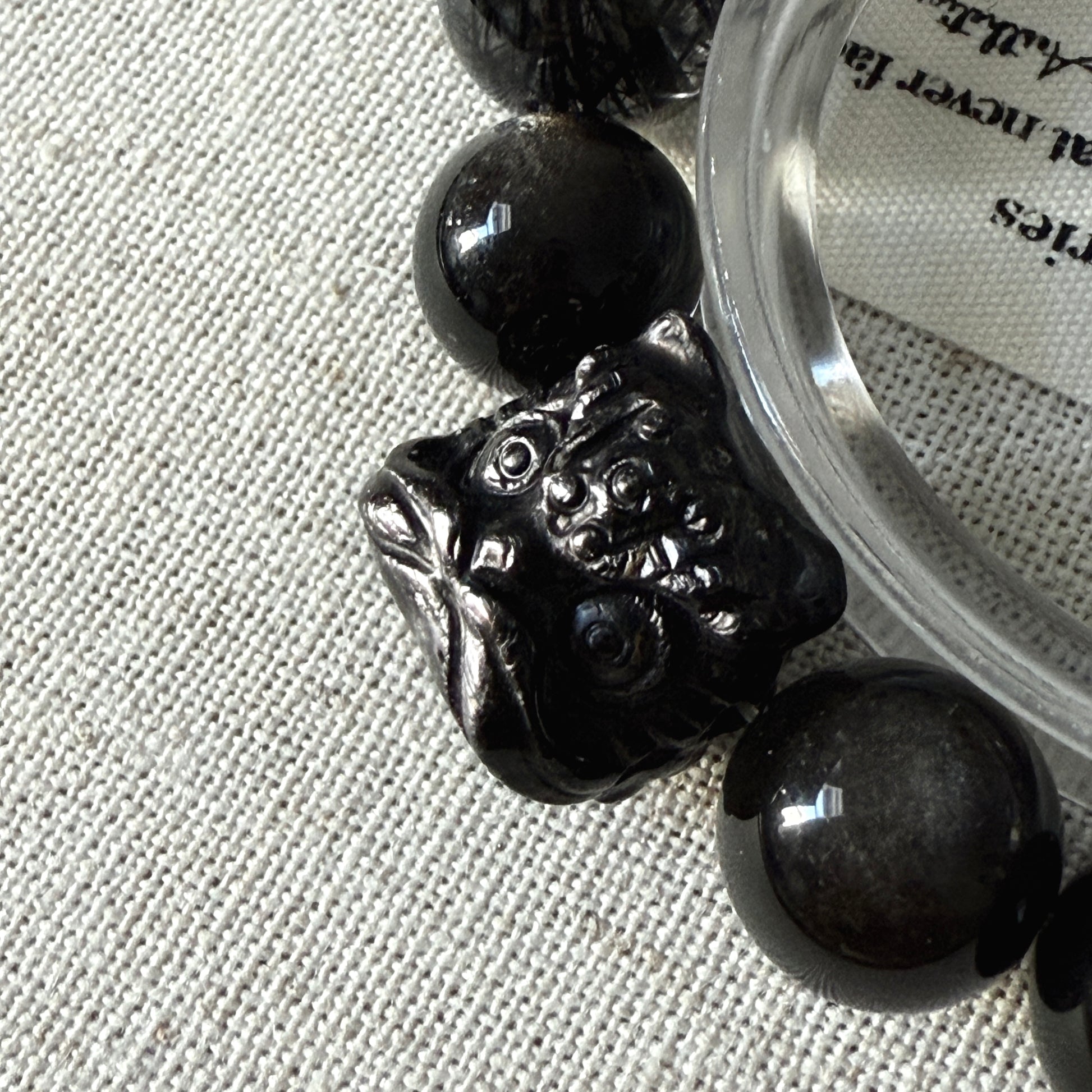 Dark Night Design Hypersthene Lion with Black Rutile Obsidian Beaded Bracelet