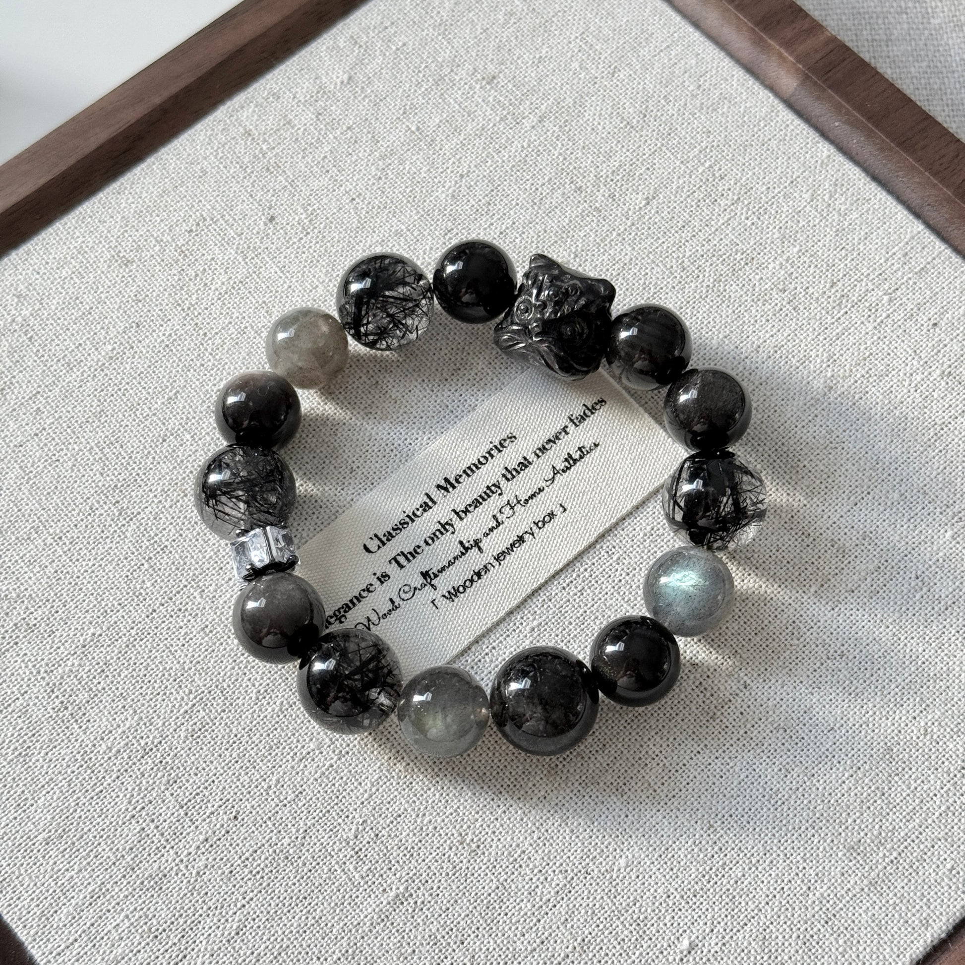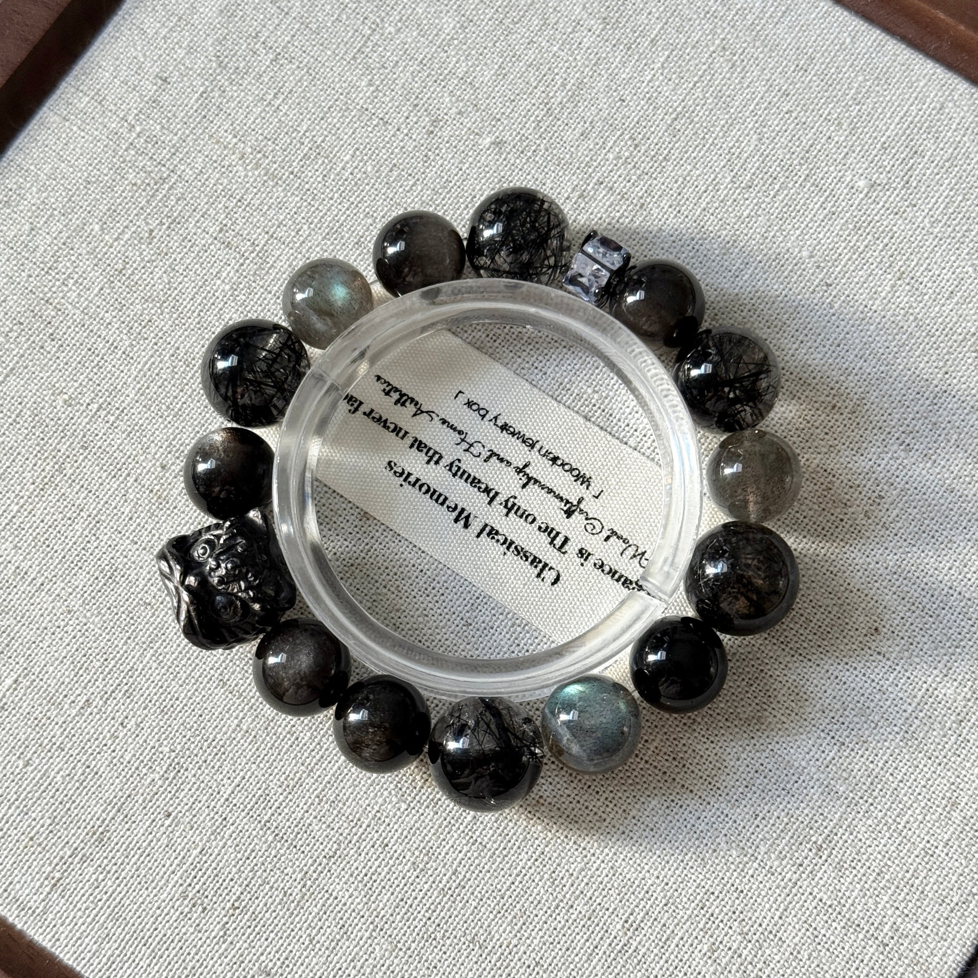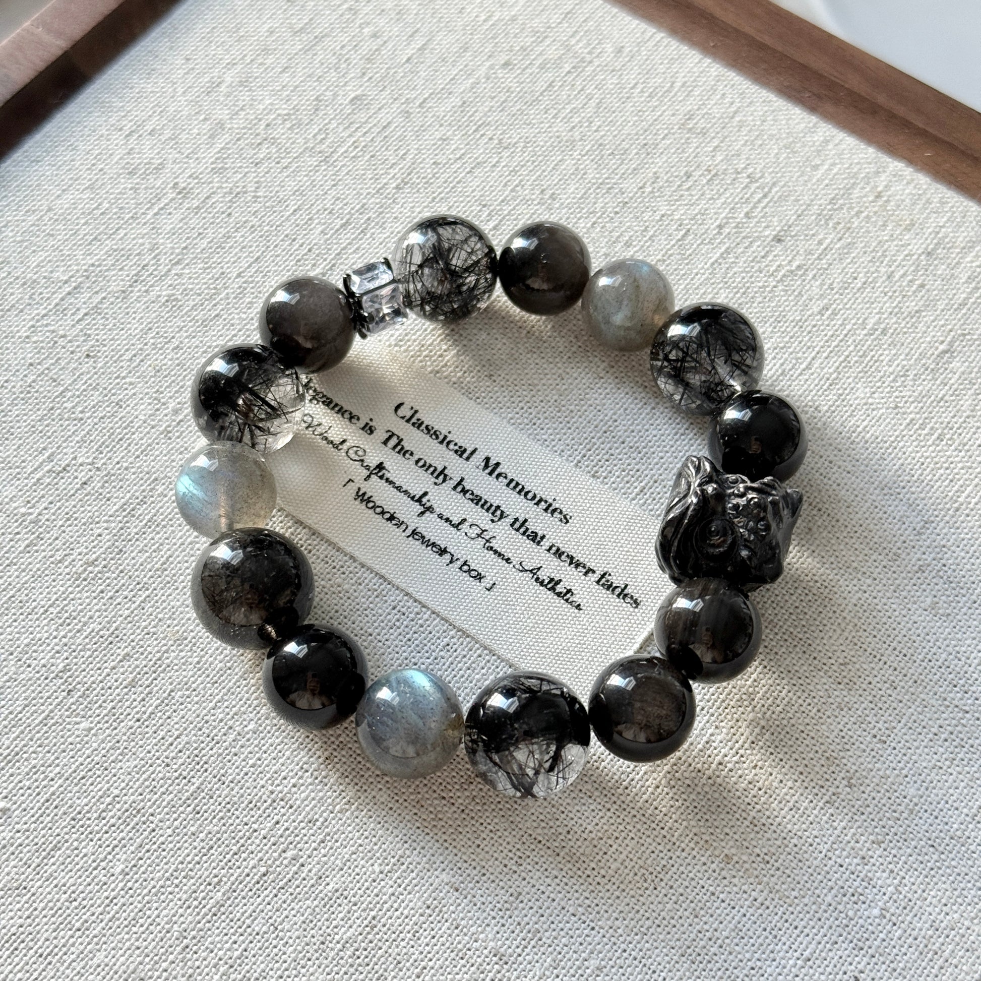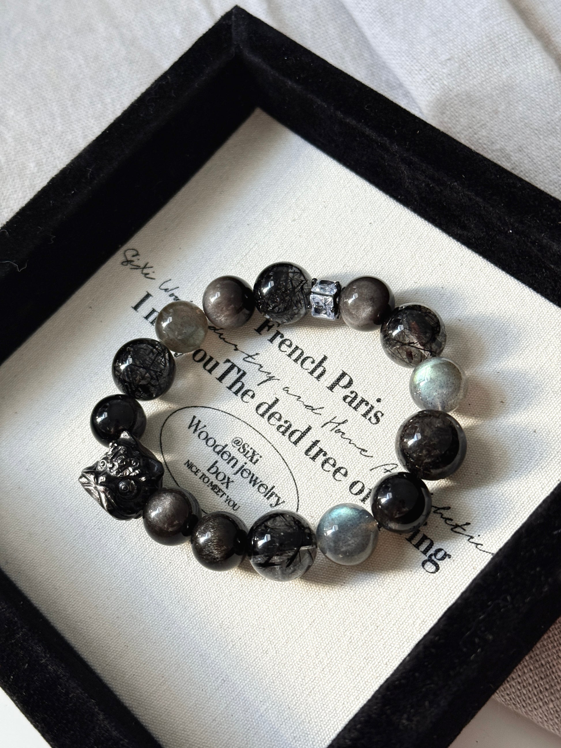 Materials: silver obsidian + black rutile + hypersthene + labradorite